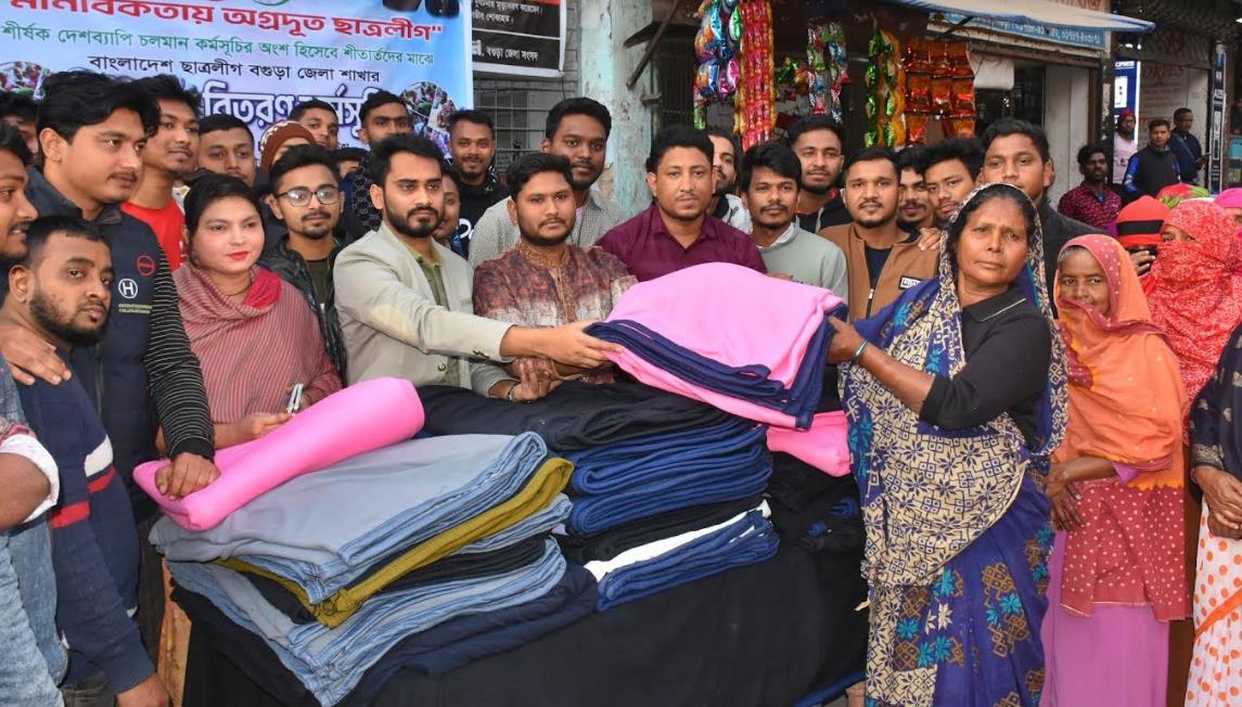 বগুড়া জেলা ছাত্রলীগের সভাপতি সজীব সাহার সভাপতিত্বে ও সাধারণ সম্পাদক আল মাহিদুল ইসলাম জয়ের পরিচালনায় প্রায় ৫ শতাধিক দুস্থ, অসহায় ও ছিন্নমূল মানুষের শীতবস্ত্র বিতরণ করা হয়।