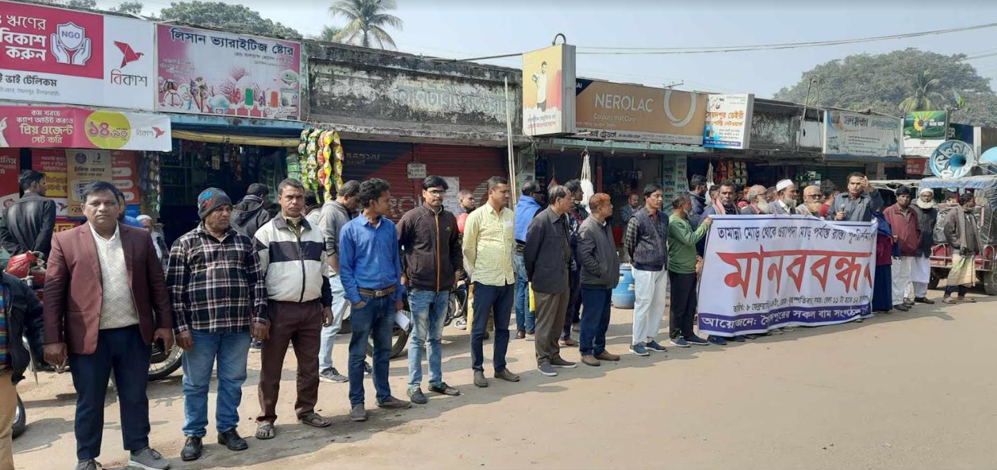 বেলা ১১ টা থেকে ১২ টা পর্যন্ত শহরের তামান্না সিনেমা হল মোড় থেকে ওয়াপদা মোড় পর্যন্ত শেরে বাংলা সড়কের সাড়ে তিন কিলোমিটার এলাকাজুড়ে বিভিন্ন স্থানে উল্লিখিত সংগঠনের ব্যানারে মানববন্ধন করা হয়। এতে অংশগ্রহনকারী বিভিন্ন সংগঠন বিপুল সংখ্যক নেতাকর্মী,সমর্থক ছাড়াও শহরের সর্বস্তরের মানুষ স্বতঃস্ফুর্তভাবে অংশগ্রহন করেন।