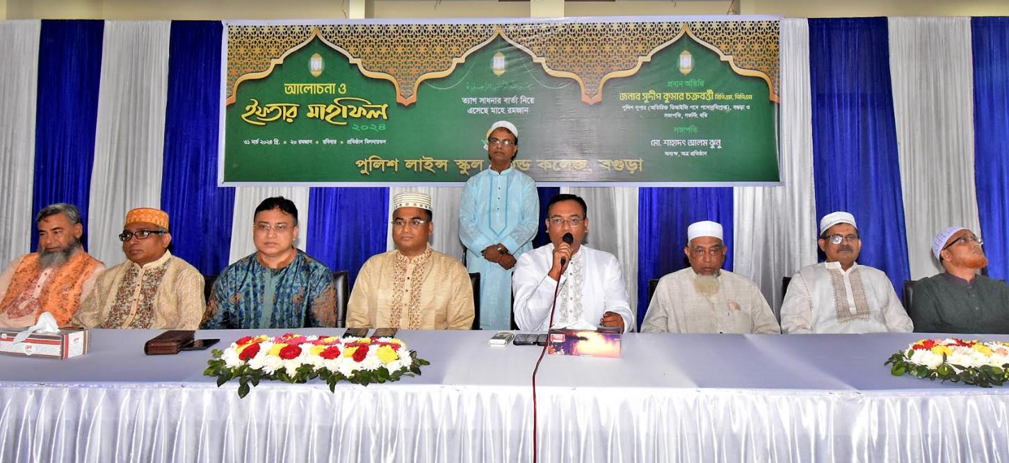 রোববার বিকেলে বগুড়া পুলিশ লাইন্স স্কুল অ্যান্ড কলেজে আলোচনা ও ইফতার মাহফিল অনুষ্ঠিত হয়েছে। অত্র শিক্ষা প্রতিষ্ঠানের অধ্যক্ষ শাহাদৎ আলম ঝুনুর সভাপতিত্বে প্রধান অতিথির বক্তব্য রাখেন পুলিশ সুপার (পদোন্নতিপ্রাপ্ত অতিরিক্ত ডিআইজি) সুদীপ কুমার চক্রবর্ত্তী বিপিএম পিপিএম।