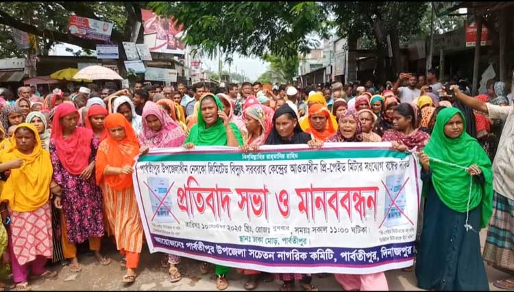 পার্বতীপুরে প্রিপেইড মিটার সংযোগ বন্ধের দাবীতে প্রতিবাদ সভা ও মানববন্ধন
