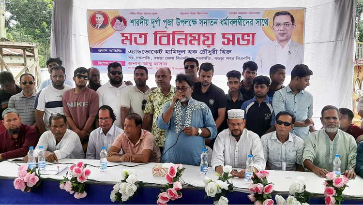 সনাতন ধর্মাবলস্বীদের আসন্ন শারদীয় দুর্গাপুজা উপলক্ষ্যে বগুড়া-৩ আসনের জাতীয়তাবাদী দল বিএনপির মনোনয়ন প্রত্যাশী বগুড়া শহর বিএনপির সভাপতি এ্যাডভোকেট হামিদুল হক চৌধুরী হিরু আদমদীঘি উপজেলার ৬৫টি মন্দির নেতৃবৃন্দের সাথে মতবিনিময় ও আর্থিক সহায়তা প্রদান করেছেন। গতকাল সোমবার (২২ সেপ্টেম্বর) বেলা ১১টায় উপজেলার তালশন কালীবাড়ি মন্দির চত্ত্বরে এই মতবিনিময় সভা অনুষ্ঠিত হয়।
