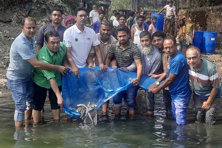 শেরপুরে যুবদলের প্রতিষ্ঠাবার্ষিকীতে করতোয়ায় পোনা মাছ অবমুক্ত