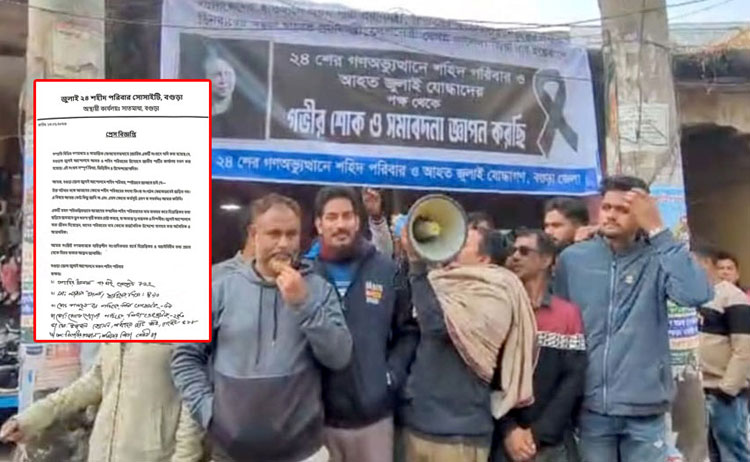 মঙ্গলবার (১৩ জানুয়ারি) সংগঠনটির পক্ষ থেকে পাঠানো এক সংবাদ বিজ্ঞপ্তিতে জানানো হয়, উক্ত ঘটনার সঙ্গে বগুড়া জেলার কোনো শহীদ পরিবারের সদস্য, আহত ব্যক্তি কিংবা সংগঠনের কোনো পর্যায়ের নেতাকর্মী কোনোভাবেই জড়িত নন। এ বিষয়ে তারা কেউ অবগত নন এবং এমন কোনো কর্মসূচি গ্রহণ বা সমর্থনও করেননি।