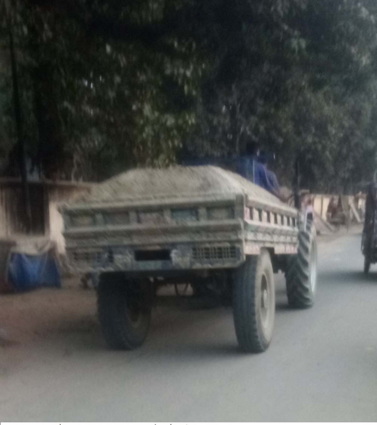 ঘোড়াঘাটে ঢাকনা ছাড়াই ট্রাক্টরে বালু বহন করা হচ্ছে।