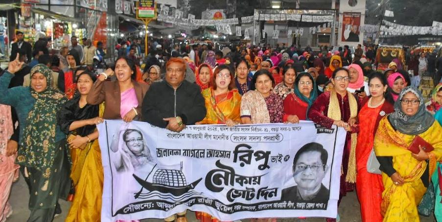 বগুড়া-৬ সদর আসনে রাগেবুল আহসান রিপুকে নৌকা মার্কায় ভোট দিয়ে বিজয় নিশ্চিত করার লক্ষ্যে বুধবার বিকেলে প্রচার মিছিল জেলা মহিলা আওয়ামী লীগের উদ্যোগে অনুষ্ঠিত হয়েছে। জেলা মহিলা আওয়ামী লীগের সাধারণ সম্পাদক সাবিয়া সাবরিন পিংকি সরকারের সভাপতিত্বে প্রধান অতিথির বক্তব্য রাখেন জেলা আওয়ামী লীগের যুগ্ম সাধারণ সম্পাদক একেএম আসাদুর রহমান দুলু।