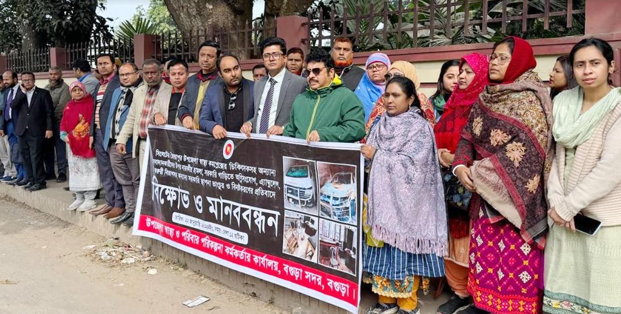 স্বাস্থ্য কমপ্লেক্সে হামলাকারিদের গ্রেফতারের দাবীতে বগুড়ায় মানববন্ধন