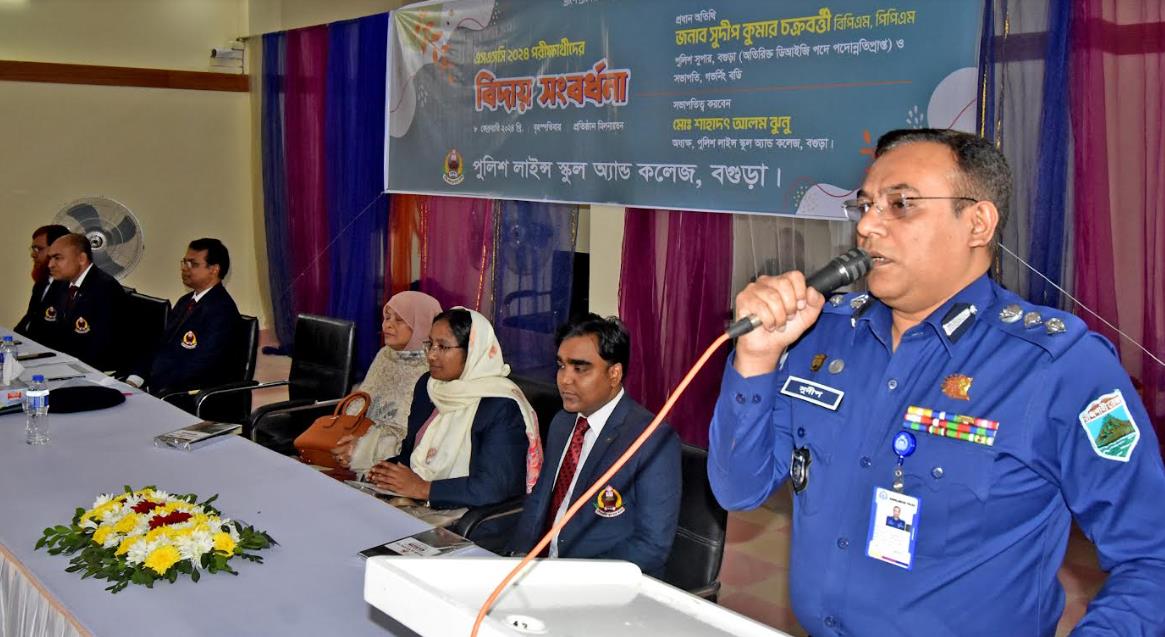 বৃহস্পতিবার দুপুরে বগুড়া পুলিশ লাইন্স স্কুল অ্যান্ড কলেজের এসএসসি ২০২৪ পরীক্ষার্থীদের বিদায় সংবর্ধনা অত্র প্রতিষ্ঠান অডিটোরিয়ামে অনুষ্ঠিত হয়েছে। অত্র প্রতিষ্ঠানের অধ্যক্ষ শাহাদৎ আলম ঝুনুর সভাপতিত্বে প্রধান অতিথির বক্তব্য রাখেন পুলিশ সুপার (অতিরিক্ত ডিআইজি পদে পদোন্নতিপ্রাপ্ত) সুদীপ কুমার চক্রবর্ত্তী বিপিএম, পিপিএম।