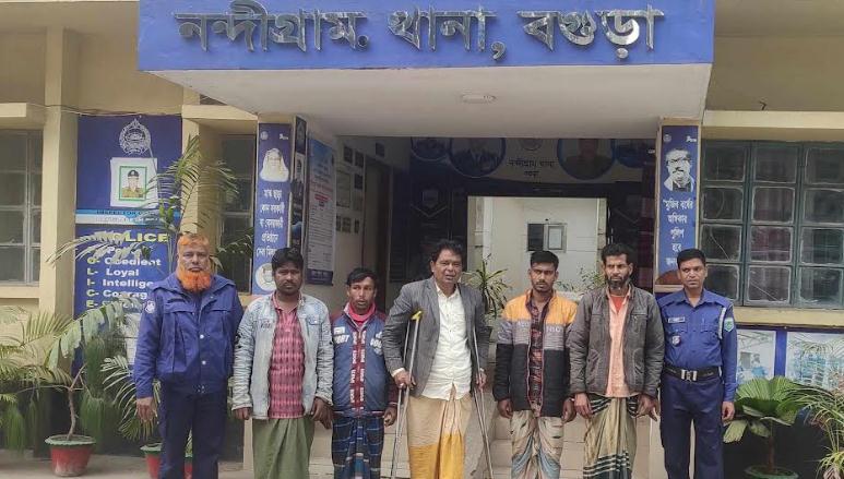 আটককৃতরা হলেন- হাটলাল গ্রামের মৃত রইচ উদ্দিনের ছেলে নন্দীগ্রাম সদর ইউনিয়ন পরিষদের সাবেক সদস্য সাইফুল ইসলাম গোলাপ(৫৩), মকবুল হোসেনের ছেলে গোলাম মোস্তফা (৫১), মৃত মোহম্মাদ আলীর ছেলে ওবাইদুল ইসলাম(৩৫), আব্দুর রশিদের ছেলে জাহিদ হোসেন(২১), ও নাটোর জেলার সিংড়া থানার শুকাস ইউনিয়নের আদখোলা গ্রামের মৃত আলাউদ্দিনের ছেলে মজিদ(৩৬)।