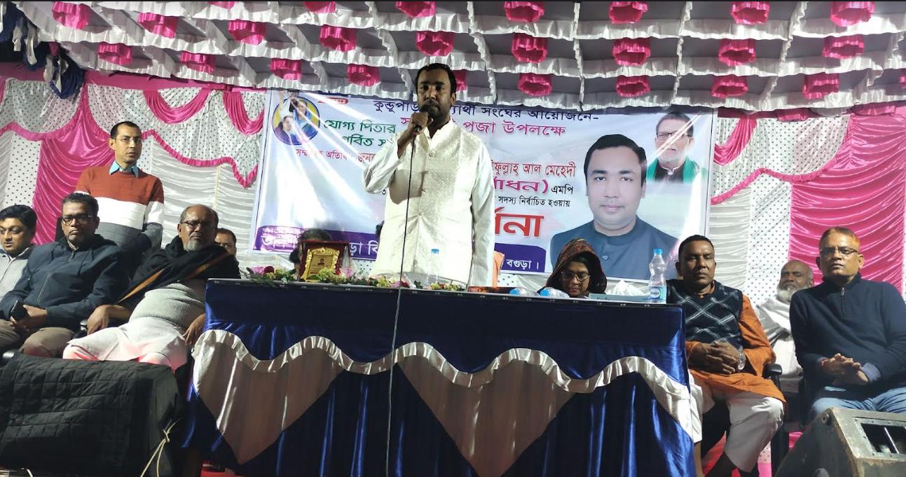 তিনি গত বৃহস্পতিবার (১৫ ফ্রেব্রুয়ারী) রাত ৯ টায় বগুড়ার আদমদীঘি উপজেলা সদরের তালসন কুন্ডুপাড়া বিদ্যার্থী সংঘের সরস্বতী পুজা উপলক্ষে আয়োজিত সংবর্ধনা,সাংস্কৃতিক ও আলোচনা সভা অনুষ্ঠানে প্রধান অতিথি হিসেবে উপরোক্ত কথা গুলো বলেন। তালসন কুন্ডুপাড়া বিদ্যার্থী সংঘের সভাপতি দিব্যেন্দু কুন্ডু দুলালের সভাপতিত্বে অনুষ্ঠানে বিশেষ অতিথির বক্তব্য রাখেন উপজেলা মহিলা ভাইস চেয়ারম্যান সালমা বেগম চাঁপা,সদর ইউপি চেয়ারম্যান জিল্লুর রহমান,উপজেলা আ’লীগের সহ-সভাপতি নাজিমুল হুদা খন্দকার,বিআরডিবি চেয়ারম্যান মিজানুর রহমান বাবু,উপজেলা আ’লীগের সাংগঠনিক সম্পাদক সুমিনুল ইসলাম,ইউনিয়ন আ’লীগ সম্পাদক রফিকুল ইসলাম। অনুষ্ঠানে উপস্থিত ছিলেন উপজেলা পুজা উদযাপন পরিষদের সাধারন সম্পাদক মিহির কুমার সরকার,স্থানীয় ইউপি মেম্বার এনামুল হক শাহ,ওর্য়াড আ’লীগের সভাপতি দুলাল মন্ডল,সম্পাদক আনন্দ কুন্ডু,ছাত্রলীগ নেতা শাকিবুল হাসান সাকিব,আরিফিন খান তনু,বিদ্যার্থী সংঘের সাধারন সম্পাদক উজ্জল সরকার, কোষাধ্যক্ষ জগাই কুন্ডু প্রমুখ।