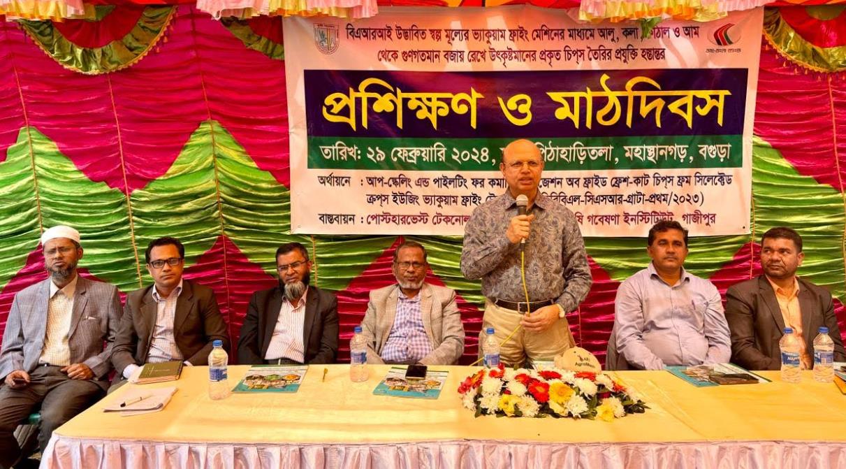 বিএআরআই উদ্ভাবিত স্বল্প মূল্যের ভ্যাকুয়াম ফ্রাইং মেশিনের মাধ্যমে বগুড়ায় আলু, কলা, কাঁঠাল ও আম থেকে গুণগত মান বজায় রেখে চিপস উৎপাদন ও বিপণন করবে উদ্যোক্তারা। ব্যতিক্রমী এই উদ্যোগ নিয়েছে বাংলাদেশ কৃষি গবেষণা ইনস্টিটিউটের (বারি) পোস্ট হারভেস্ট টেকনোলজি বিভাগ যেখানে অর্থায়নের মাধ্যমে এগিয়ে এসেছে ডিবিবিএল। সেই লক্ষ্যে বৃহস্পতিবার সকালে বগুড়া মহাস্থানগড়ের পিঠাহারীতলা এলাকায় উক্ত প্রকল্প বাস্তবায়নে চিপস তৈরির প্রযুক্তি হস্তান্তরসহ অনুষ্ঠিত হয়েছে প্রশিক্ষণ ও মাঠদিবস যেখানে অংশ নেয় সাধারণ কৃষক ও তরুণ উদ্যোক্তারা।