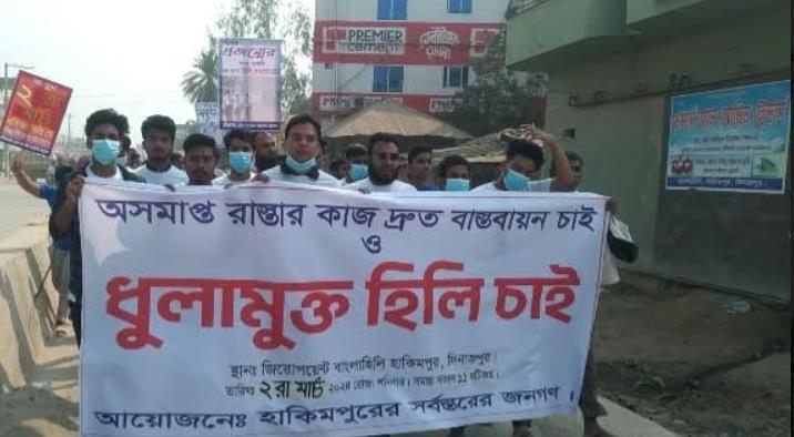 তারা আরও বলেন, দীর্ঘদিন হিলির ফোরলান সড়কের চলমান নির্মাণ কাজ বন্ধ রয়েছে। এই সড়ক দিয়ে সকল প্রকার যানবাহন চলাচলে অনুপযোগী হয়ে আছে। খানাখন্দে ভরা রাস্তা আর ধুলায় রোগীরা হাসপাতালে যেতে পারে না। আমরা দেশের নাগরিক, সরকারের নিকট আমাদের দাবি দ্রুত সড়ক নির্মাণ কাজ শেষ করে, সুন্দর একটি শহর উপহার দিবেন।