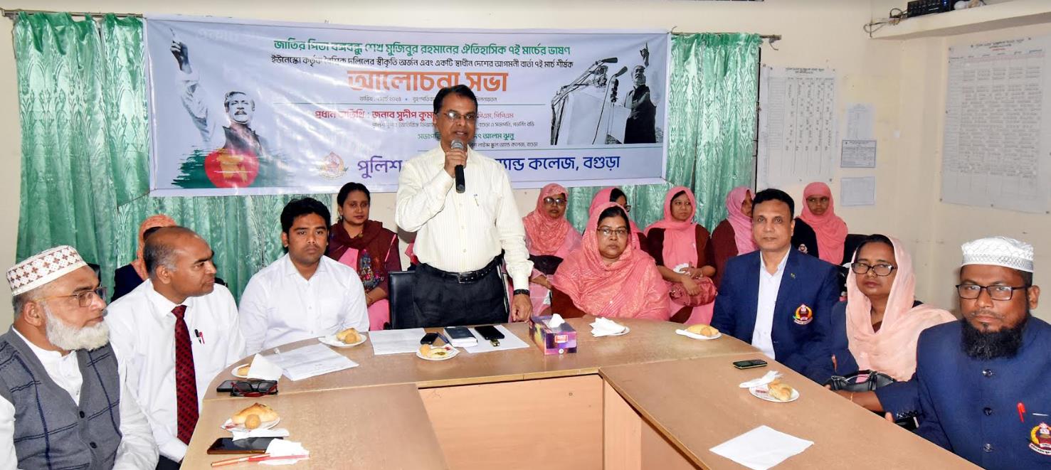 বৃহস্পতিবার দুপুরে বগুড়া পুলিশ লাইন্স স্কুল অ্যান্ড কলেজের শিক্ষক মিলনায়তনে জাতির পিতা বঙ্গবন্ধু শেখ মুজিবুর রহমানের ঐতিহাসিক ৭ই মার্চের ভাষণ ইউনেস্কো কর্তৃক বৈশ্বিক দলিলের স্বীকৃতি অর্জন এবং একটি স্বাধীন দেশের আগমনী বার্তা ৭ই মার্চ শীর্ষক আলোচনা সভা অনুষ্ঠিত হয়েছে। আলোচনা সভায় সভাপতিত্ব করেন অত্র প্রতিষ্ঠানের অধ্যক্ষ শাহাদৎ আলম ঝুনু।