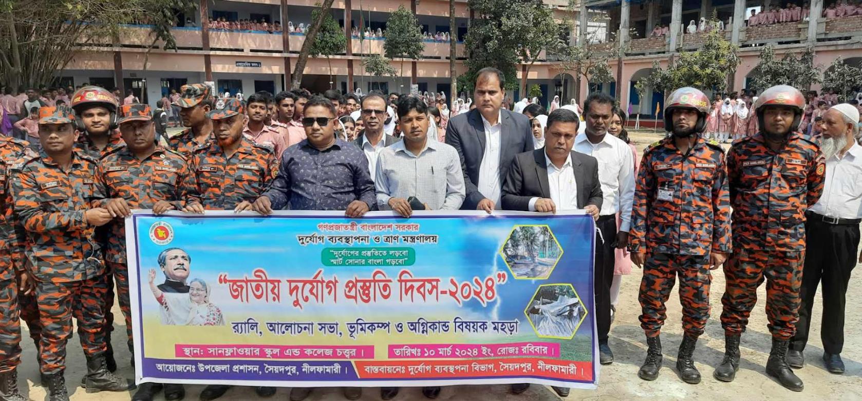 রোববার নীলফামারীর সৈয়দপুরে জাতীয় দুর্যোগ প্রস্তুতি দিবস - ২০২৪ পালিত হয়েছে। উপজেলা প্রশাসনের আয়োজনে দিবসটি বাস্তবায়নে দুর্যোগ ব্যবস্থাপনা ও ত্রাণ মন্ত্রণালয়ের অধীন সৈয়দপুর দুর্যোগ ব্যবস্থাপনা বিভাগ র্যালি, আলোচনা সভা, ভূমিকম্প ও অগ্নিকান্ড বিষয়ক মহড়া অনুষ্ঠিত হয়। শহরের কয়ানিজপাড়াস্থ সানফ্লাওয়ার স্কুল এন্ড কলেজ মাঠে “দুর্যোগের প্রস্তুতিতে লড়বো, স্মার্ট সোনার বাংলা গড়বো” দিবসের এবারের প্রতিপাদ্যকে সামনে রেখে ওই আলোচনা সভার আয়োজন করা হয়।