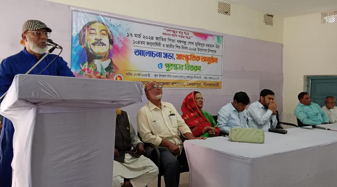 রোবরার সারাদেশে মতো নীলফামারীর সৈয়দপুরেও জাতির পিতা বঙ্গবন্ধু শেখ মুজিবুর রহমান এর ১০৪ তম জন্মবার্ষিকী ও জাতীয় শিশু দিবস পালিত হয়েছে। বেলা ১১টায় উপজেলা প্রশাসনের আয়োজনে উপজেলা পরিষদ মিলনায়তনে জাতীয় শিশু দিবস এর এক আলোচনা সভা অনুষ্ঠিত হয়।