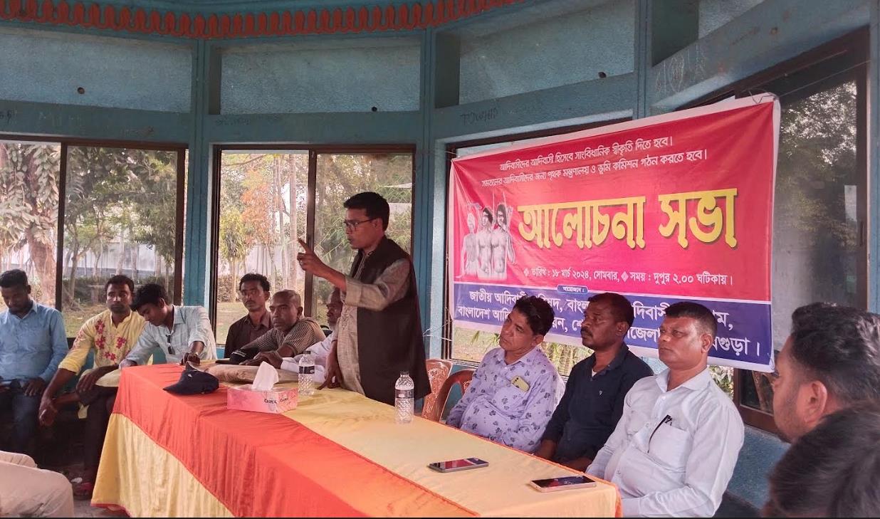 বাংলাদেশ আদিবাসী ইউনিয়ন বগুড়া জেলা শাখার সভাপতি শ্রীকান্ত মাহাতো এর সভাপতিত্বে এবং আদিবাসী ছাত্র পরিষদ বগুড়া জেলা শাখার সাধারণ সম্পাদক সাগর কুমার সিং এর সঞ্চালনায় আলোচনা সভায় বক্তব্য রাখেন জাতীয় আদিবাসী পরিষদ বগুড়া জেলা শাখার সভাপতি শ্রী সন্তোস সিং (বাবু), বাংলাদেশ আদিবাসী ফোরাম বগুড়া জেলা শাখার সভাপতি বাসুদেব রায় বাগদী।