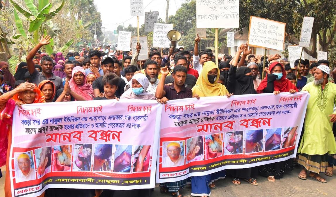 মঙ্গলবার বগুড়া সদরের নামুজা চৌমোহনী এলাকায় সহস্রাধিক এলাকাবাসী রাস্তা অবরোধ করে বিচারের দাবিতে মানববন্ধন শুরু করে। মানববন্ধনে বক্তব্য রাখেন নিহতের স্ত্রী আবেদা বেগম, বোন নারগিছ, জামাই মোমিন শেখ, স্থানীয় সাবেক মেম্বার সাইফুল ইসলাম আলম, বর্তমান মেম্বার বজলু ও রুবেল, শিহাব উদ্দিন, মাহফুজ, মুকুল হায়দার, রবিউল ইসলাম সহ আরও অনেকে।