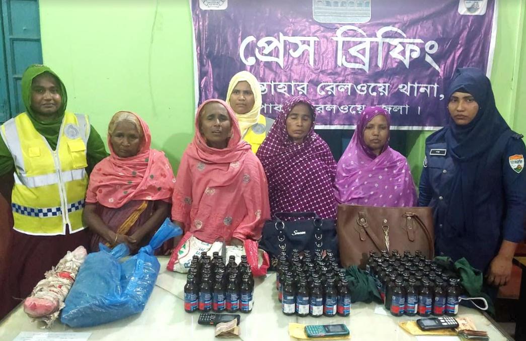 সান্তাহার রেলওয়ে থানার ওসি মোক্তার হোসেন জানান, গত মঙ্গলবার রাতে বুড়িমারী থেকে সান্তাহার স্টেশনগামী করতোয়া এক্সপ্রেস ট্রেনে মাদক বিরোধী অভিযান পরিচালনা করা হয়। অভিযানে চার নারীকে সন্দেহ মনে হওয়ায় তাদের তল্লাশি করা হয়। এসময় মাদক কারবারি সালমা আকতারের কাছে থেকে ৩৪ বোতল, শিউলি বেগমের কাছে থেকে ৩৫ বোতল ও মোরশেদার কাছে থেকে ২৮ বোতল নিষিদ্ধ ফেনসিডিল এবং সানোয়ারা বিবির কাছে থেকে দেড় কেজি গাঁজা উদ্ধার করা হয়েছে। এ ঘটনায় তাদের বিরুদ্ধে মাদক আইনে মামলা দিয়ে আদালতে পাঠানো হয়েছে।