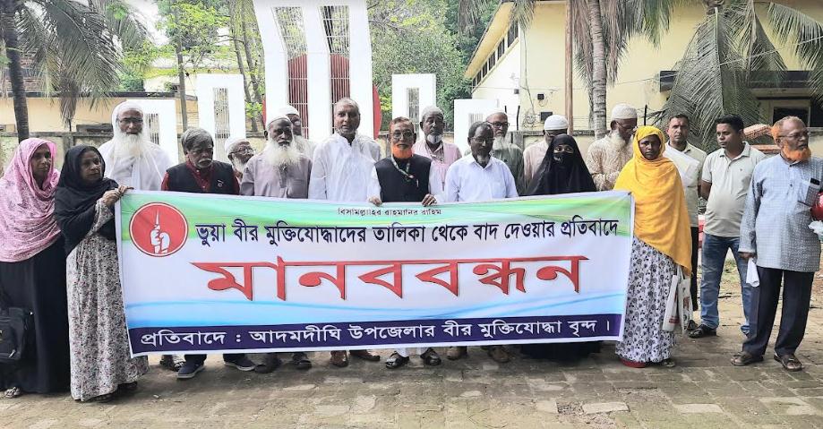 বগুড়ার আদমদীঘি উপজেলার ১৮ জন ভাতাপ্রাপ্ত বীর মুক্তিযোদ্ধাকে ভুয়া আখ্যায়িত করে তালিকা থেকে বাদ দেওয়ার ষড়যন্ত্রের প্রতিবাদে মানববন্ধন করা হয়েছে। গতকাল সোমবার বেলা ১২টায় উপজেলা পরিষদ চত্বরে শহীদ মিনারের সামনে ঘন্টাব্যপী এই মানববন্ধন অনুষ্ঠিত হয়। এরপর ১৪ জন বীর মুক্তিযোদ্ধা স্বারিত উপজেলা নির্বাহি কর্মকর্তা (ইউএনও) বরাবর একটি লিখিত পত্র প্রদান করা হয়েছে।