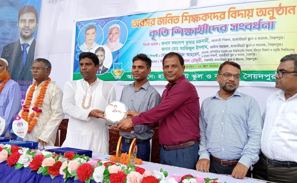 নীলফামারীর সৈয়দপুরে হাজারীহাট স্কুল ও কলেজের অবসরজনিত শিক্ষকদের বিদায়ী ও কৃতি শিক্ষার্থীদের সংবর্ধনা দেয়া হয়েছে। গতকাল সোমবার (১০ জুন) বিকেলে উপজেলার কাশিরাম বেলপুকুর ইউনিয়নের হাজারীহাটে অবস্থিত শিক্ষা প্রতিষ্ঠানটির চত্বরে ওই বর্ণাঢ্য অনুষ্ঠানের আয়োজন করা হয়।