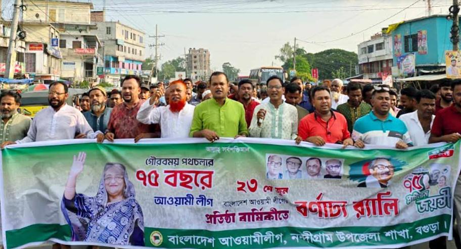 বগুড়ার নন্দীগ্রামে নানা আয়োজনে আওয়ামী লীগের ৭৫তম প্রতিষ্ঠাবার্ষিকী পালিত হয়েছে। এ উপল্েয রবিবার (২৩ জুন) বিকেল ৫টায় উপজেলা আওয়ামী লীগের উদ্যোগে নন্দীগ্রাম বঙ্গবন্ধু চত্বর থেকে একটি র্যালি বের হয়। র্যালিটি নন্দীগ্রাম শহরের বিভিন্ন সড়ক প্রদক্ষিণ করে।