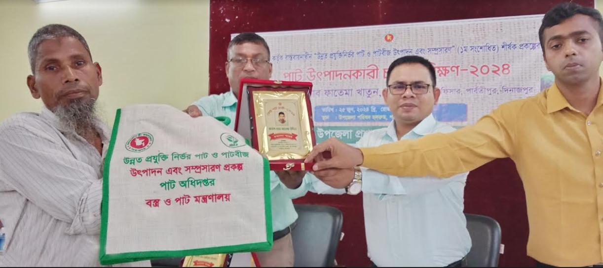 পাট চাষ ও বীজ উৎপাদন, সচেতনতা ও দক্ষতাবৃদ্ধির লক্ষ্যে দিনাজপুরের পার্বতীপুরে দিনব্যাপী পাটবীজ উৎপাদনকারী চাষীদের প্রশিক্ষণ হয়েছে। উপজেলা প্রশাসন ও পাট অধিদপ্তরের উদ্যোগে আজ মঙ্গলবার উপজেলা হলরুমে উন্নত প্রযুক্তিনির্ভর পাট ও পাটবীজ উৎপাদন এবং সম্প্রসারণ প্রকল্পের আওতায় চাষিদের এই প্রশিক্ষণ দেওয়া হয়।