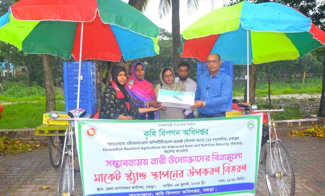বগুড়ায় কৃষি বিপণন অধিদপ্তরের আয়োজনে স্মল হোল্ডার এগ্রিকালচার কম্পিটিটিভনেস প্রকল্পের রেইনস্ অংশের আওতায় সম্ভাবনাময় তিন নারী উদ্যোক্তাকে স্বাবলম্বী করতে বিনামূল্যে মার্কেট স্ট্যান্ড স্থাপনের উপকরণ বিতরণ করা হয়েছে।