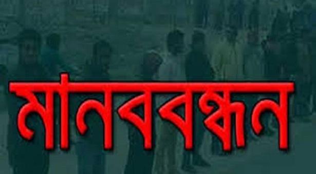সীমান্ত নদী মাহারাম শান্তিপুর থেকে অবৈধভাবে খনিজ বালি উক্তোলনের প্রতিবাদে মানববন্ধন