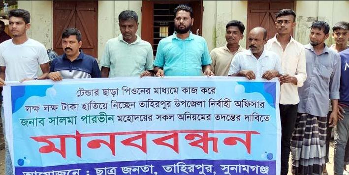 মানববন্ধনে বক্তারা আরও বলেন, ইউএনও সালমা পারভীন ১৩ ডিসেম্বর সুনামগঞ্জের তাহিরপুর উপজেলা নির্বাহী অফিসার (ইউএনও) পদে যোগদানের পর থেকেই তাহিরপুর উপজেলার হাট বাজার, নৌকাঘাট, সরকারি রাজস্ব আয়যোগ্য সব সেক্টরে অনিয়ম ও দুর্নীতির কালো হাত প্রসারিত করে গোটা উপজেলাকে দুর্নীতির স্বর্গরাজ্যে পরিণত করেছেন। তার বিরুদ্ধে জাদুকাটা, রক্তি, পাটলাই নদীর নৌপথজুড়ে টোল ট্যাক্সের নামে চাঁদাবাজি করানো, জাদুকাটা নদীতে শতাধিক ড্রেজারে অবৈধভাবে খনিজ বালি-পাথর উত্তোলন এমনকি নিজের নামেও বিভিন্ন ব্যবসায়ী, শ্রমিক দিয়ে একাধিক ড্রেজার চালিয়ে কোটি কোটি টাকার খনিজ বালি-পাথর লুটে নেওয়ার অভিযোগ রয়েছে নদীর তীরবর্তী মানুষজনের।
