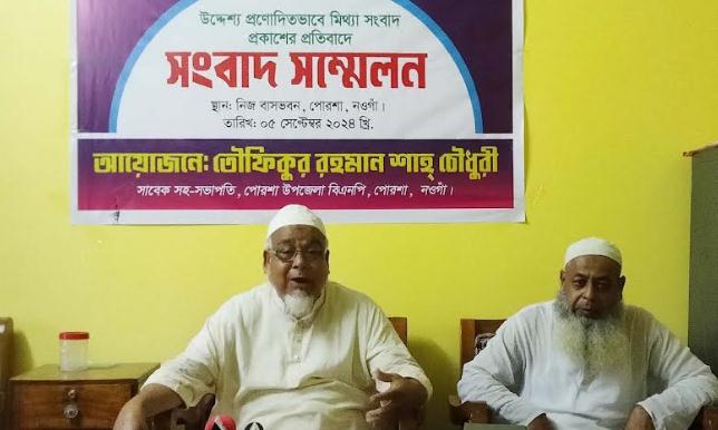 ষড়যন্ত্রমুলক ও উদ্দেশ্য প্রণোদিতভাবে পত্রিকায় সংবাদ প্রকাশের প্রতিবাদে নওগাঁর পোরশা উপজেলা বিএনপির সাবেক সহ-সভাপতি আলহাজ্ব তৌফিকুর রহমান শাহ্ চৌধুরী সংবাদ সম্মেলন করেছেন। গতকাল বৃহস্পতিবার তার নিজ বাসভবনে সংবাদ সম্মেলনে তিনি লিখিত বক্তব্যে বলেন, গত ৩ সেপ্টেম্বর ঢাকা থেকে প্রকাশিত দুইটি পত্রিকায় “পোরশায় ৬ কৃষকের জমি দখলে নিল বিএনপি নেতা” শিরোনামে এবং “বিএনপি নেতার বিরুদ্ধে কৃষকের জমি দখলের অভিযোগ” শিরোনামে প্রকাশিত খবরটি তার দৃষ্টিগোচর হওয়ায় এই সংবাদ সম্মেলন করেন। পত্রিকা দুটিতে প্রকাশিত সংবাদে তার নাম দিয়ে জমি দখলের যে তথ্য প্রকাশ করা হয়েছে তাহা সম্পুর্ণ মিথ্যা, বানোয়াট ও উদ্দেশ্য প্রণোদিত বলে তিনি জানান।