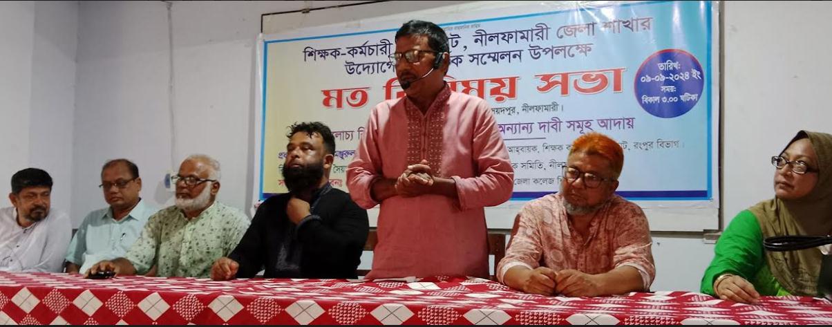 নীলফামারী জেলা কলেজ শিক্ষক সমিতির সদস্য সচিব মো. আসাদুজ্জামান রাফু’র সভাপতিত্বে এবং কামারপুকুর ডিগ্রী কলেজের সহকারী অধ্যাপক মো. সাইফুল ইসলামের সঞ্চালনায় মতবিনিময় সভায় অন্যান্যদের মধ্যে বক্তব্য রাখেন সৈয়দপুর মহিলা মহাবিদ্যালয়ের অধ্যক্ষ (ভারপ্রাপ্ত) মো. শাহীদ শাহাব, সৈয়দপুর আদর্শ বালিকা বিদ্যালয় ও কলেজের অধ্যক্ষ মো. হাবিবুর রহমান হাবিব, সৈয়দপুর মহিলা মহাবিদ্যালয়ের উপাধ্যক্ষ সাবিনা সালাম ও প্রভাষক ছায়া রাণী রায়, কামারপুকুর কলেজের সহকারী অধ্যাপক মো. মিজানুর রহমান মুকুল, সৈয়দপুর আদর্শ বালিকা বিদ্যালয় ও কলেজের জ্যেষ্ঠ প্রভাষক মো. আলমগীর হোসেন সরকার প্রমুখ।
