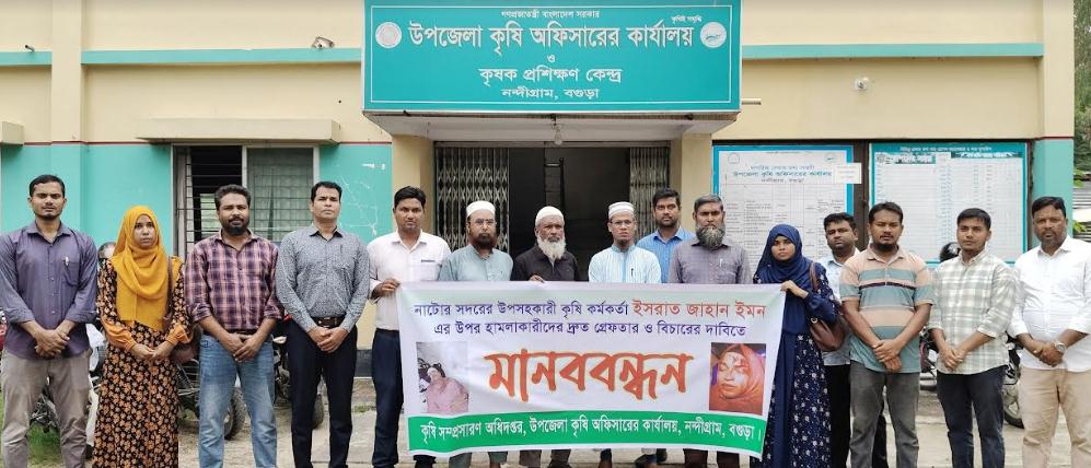 নাটোর সদরের উপ-সহকারী কৃষি কর্মকর্তা ইসরাত জাহান ইমন এর উপর হামলাকারীদের দ্রুত গ্রেফতার ও বিচারের দাবীতে বগুড়ার নন্দীগ্রামে ২৯ শে সেপ্টেম্বর (রবিবার) দুপুর ২টায় কৃষি সম্প্রসারণ অধিদপ্তর উপজেলা কৃষি অফিসারের কার্যালয় নন্দীগ্রাম, বগুড়া এর আয়োজনে মানববন্ধন অনুষ্ঠিত হয়েছে।