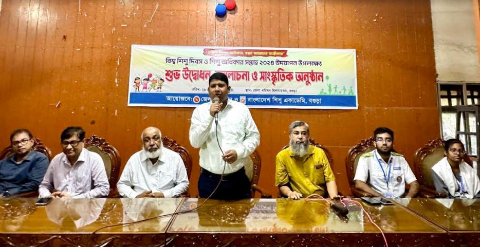 'প্রতিটি শিশুর অধিকার, রক্ষা আমাদের অঙ্গীকার' প্রতিপাদ্যতে বগুড়ায় বিশ্ব শিশু দিবস ও শিশু অধিকার সপ্তাহ ২০২৪ উদযাপন উপলক্ষে সপ্তাহব্যাপী কর্মসূচির উদ্বোধন, আলোচনা সভা ও সাংস্কৃতিক অনুষ্ঠান অনুষ্ঠিত হয়েছে। রবিবার সকালে জেলা প্রশাসন ও বাংলাদেশ শিশু একাডেমির আয়োজনে শহরের জেলা পরিষদ মিলনায়তনে প্রায় ৩ শতাধিক শিশুর প্রাণবন্ত অংশগ্রহণে এই আয়োজন হয়।
