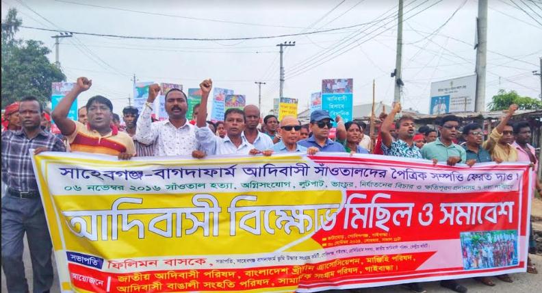সাঁওতাল হত্যা, অগ্নিসংযোগ, লুটপাট, ভাঙচুর, নির্যাতনের বিচার, ক্ষতিপূরণ প্রদানসহ ৭ দফা দাবিতে গাইবান্ধায় বিক্ষোভ মিছিল ও সমাবেশ করেছেন সাঁওতালরা।