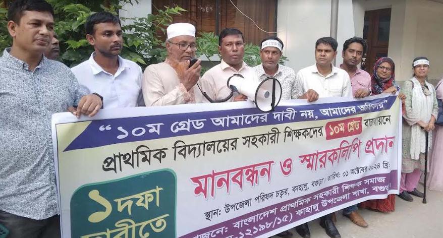 প্রাথমিক বিদ্যালয়ের সহকারি শিক্ষকদের ১০ম গ্রেড বাস্তবায়নের দাবীতে মঙ্গলবার বিকেলে বগুড়ার কাহালু উপজেলা পরিষদ চত্বরে বাংলাদেশ প্রাথমিক সহকারি শিক্ষক সমাজ কাহালু উপজেলা শাখার আয়োজনে মানববন্ধন অনুষ্ঠিত হয়।
