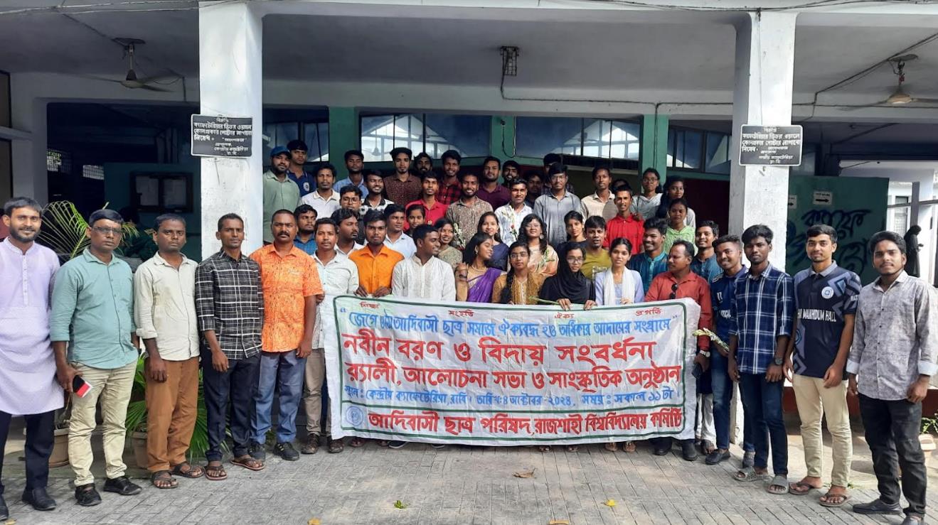আদিবাসী ছাত্র পরিষদের রাজশাহী বিশ্ববিদ্যালয় কমিটির আয়োজনে আজ সকাল ১১টার সময় রাজশাহী বিশ্ববিদ্যালয়ের কেন্দ্রীয় ক্যাফেটেরিয়াতে অনুষ্ঠিত হয়। শুরুতেই আদিবাসী শিক্ষার্থীদের নিয়ে র্যালি ক্যাফেটেরিয়া থেকে শুরু করে প্রশাসন ভবন এর সমানে দিয়ে লাইব্রেরি সামনে দিয়ে ক্যাফেটেরিয়াতে এসে শেষ হয়। আদিবাসী ছাত্র পরিষদের রাজশাহী বিশ্ববিদ্যালয় কমিটির সভাপতি সুশান্ত মাহাতো এর সভাপতিত্বে এবং সঞ্চলনা করেন আদিবাসী ছাত্র পরিষদের সদস্য সঞ্জয় কুমার উরাও। শুরুরেই জাতীয় সংগীত গেয়ে ও সকল শহীদদের প্রতি শ্রদ্ধা ও আত্মার শান্তি কামনা করে এক মিনিট নিরবতা পালন করা হয়। স্বাগত বক্তব্য রাখেন আদিবাসী ছাত্র পরিষদের রাজশাহী বিশ্ববিদ্যালয় কমিটির সাধারণ সম্পাদক লখিন সরদার।
