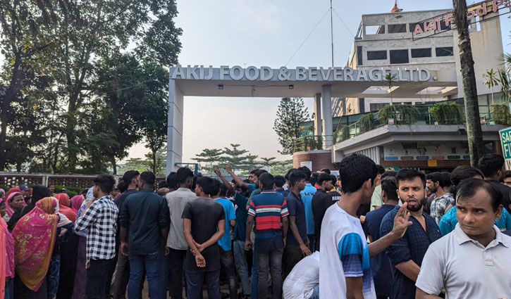 ঢাকার ধামরাইয়ে বেতন বৃদ্ধি, সাপ্তাহিক ছুটিসহ নয় দফা দাবিতে বিক্ষোভ করেছেন আকিজ ফুড অ্যান্ড বেভারেজ লিমিটেড নামে একটি কারখানার শ্রমিকরা।