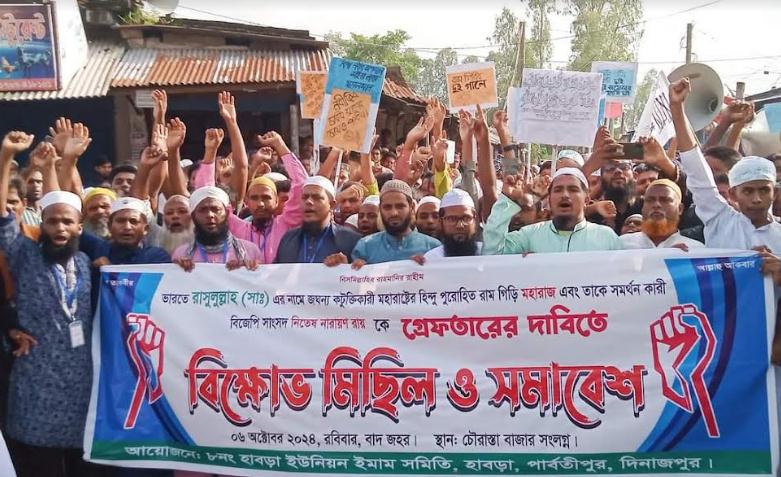 জানা গেছে,ভারতে রাসুলুল্লাহ (সাঃ) এর নামে জঘন্য কটুক্তিকারী মহারাষ্ট্রের হিন্দু পুরোহিত রাম গিড়ি মহারাজ এবং তাকে সমর্থন কারী বিজেপি সংসদ নিতেষ নারায়ণ রায়কে গ্রেফতারের দাবীতে প্রতিবাদ সমাবেশ ও বিক্ষোভ মিছিলের আয়োজন করে হাবড়া ইউনিয়ন ইমাম সমিতি। হাবড়া ইউনিয়ন ইমাম সমিতির উদ্যোগে আয়োজিত তৌহিদী জনতার প্রতিবাদ সমাবেশ ও বিক্ষোভ মিছিলটি পার্বতীপুর উপজেলার হাবড়া ইউনিয়নের চৌরাস্তা বাজারে বাদ যোহর শুরু হয় এবং সুদুর ডাঙ্গা দাখিল মাদরাসা হয়ে চৌরাস্তা বাজারের এসে শেষ হয়।