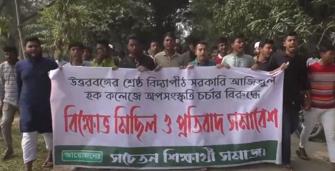 বগুড়া সরকারি আজিজুল হক কলেজে গত ২৩নভেম্বর দর্শন বিভাগের পূর্ণমিলনী অনুষ্ঠানে রাতে কনসার্ট চলাকালে দুর্বৃত্তের ছুরিকাঘাতে এক যুবক নিহত হয়। এ ঘটনার প্রতিবাদে আজ সোমবার দুপুরে কলেজ ক্যাম্পাসে সচেতন শিক্ষার্থী সমাজ এর আয়োজনে এক বিক্ষোভ মিছিল ও প্রতিবাদ সমাবেশ অনুষ্ঠিত হয়।
