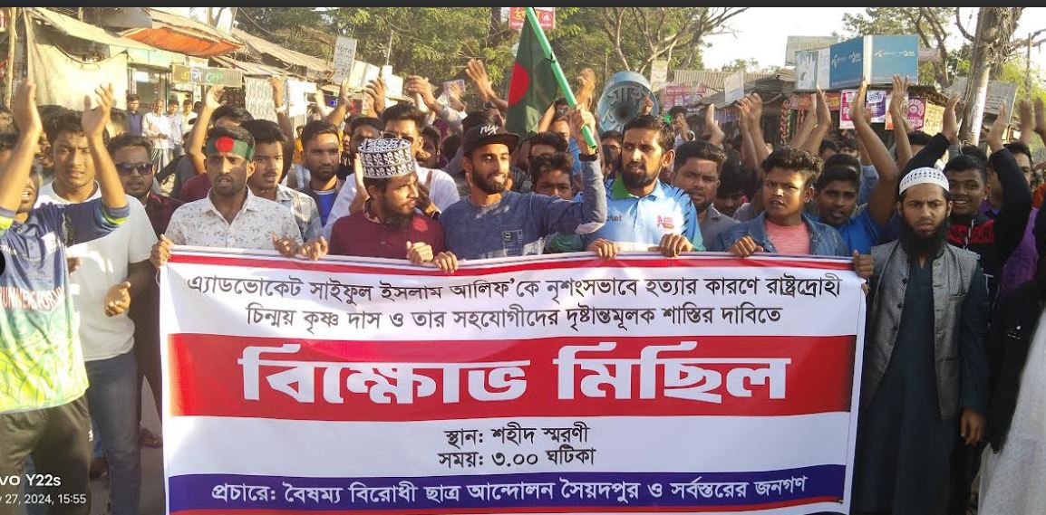 গতকাল বুধবার (২৭ নভেম্বর) বিকেলে নীলফামারীর সৈয়দপুর শহরের পাঁচমাথা মোড় ট্রাফিক বক্সের সামনে ওই বিক্ষোভ সমাবেশ করা হয়। এ সংক্ষিপ্ত সমাবেশে বক্তব্য বলেন, দিনাজপুর ইসলামী রিসার্চ সেন্টারের শিক্ষক সৈয়দ রাহাতুল আশেকিন, বৈষম্যবিরোধী ছাত্র আন্দোলনের নেতা গোলাম রাব্বানী, এমডি তাওহিদ মুক্তার, সাকির হোসেন, নীরব প্রমুখ। এর আগে শহরের বিমানবন্দর সড়কের শহীদ স্মৃতিস্তম্ভ চত্বর থেকে বিক্ষোভ মিছিল বের করা হয়। মিছিলটি শহরের বিভিন্ন সড়ক প্রদক্ষিণ করে পাঁচমাথা মোড়ের ট্রাফিক পুলিশ বক্সের সামনে গিয়ে শেষ হয়। সমাবেশে চিন্ময় কৃষ্ণ দাস ইসকনের দোসরদের শাস্তির দাবিতে বিভিন্ন শ্লোগান দেয়া হয়।