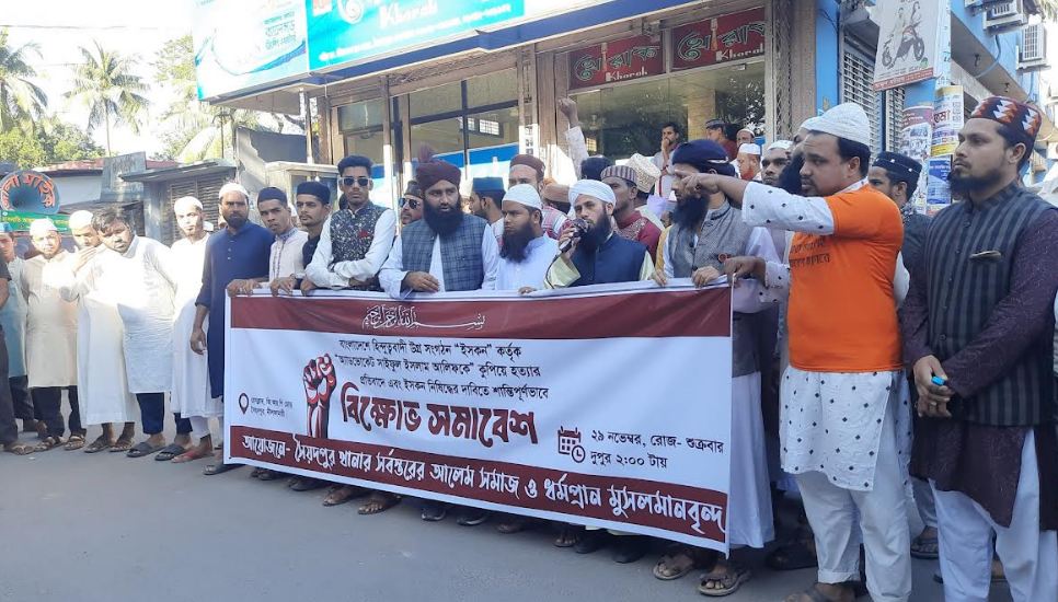 এড. সাইফুল ইসলাম আলিফকে কুপিয়ে হত্যার প্রতিবাদে এবং ইসকন নিষিদ্ধের দাবিতে নীলফামারীর সৈয়দপুরে বিক্ষোভ সমাবেশ হয়েছে। গতকাল শুক্রবার বেলা ২টায় সৈয়দপুর থানার সর্বস্তরের আলেম সমাজ ও ধর্মপ্রাণ মুসলমানবৃন্দ ব্যানারে সৈয়দপুর প্রেসক্লাবের সামনে ওই বিক্ষোভ সমাবেশ অনুষ্ঠিত হয়। এতে বিভিন্ন মসজিদ থেকে সুন্নী ও কওমী আলেম সমাজ ও সর্বস্তরের মুসল্লীরা অংশগ্রহণ করেন।