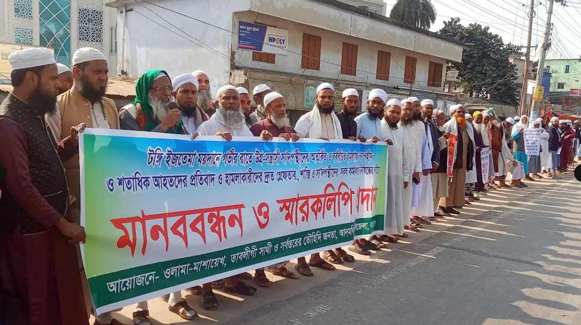 টঙ্গী ইজতেমা ময়দানে গভীর রাতে উগ্র-সন্ত্রাসীদের অতর্কিত ও বর্বরচিত হামলায় ৪ জন শহীদ ও শতাধিক আহতদের প্রতিবাদ ও হামলাকারীদের দ্রুত গ্রেফতার, শাস্তি ও সা’দ পন্থীদের সকল কর্মকান্ড নিষিদ্ধের দাবীতে বগুড়ার আদমদীঘিতে জুবায়ের পন্থীদের মানববন্ধন, উপজেলা নির্বাহী অফিসার বরাবর স্মারকলিপি প্রদান ও বিক্ষোভ সমাবেশ অনুষ্ঠিত হয়েছে।
