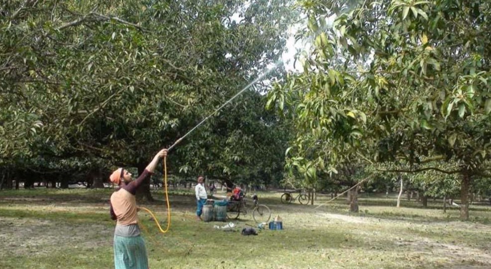 পোরশায় আম বাগান পরিচর্যায় ব্যস্ত চাষিরা