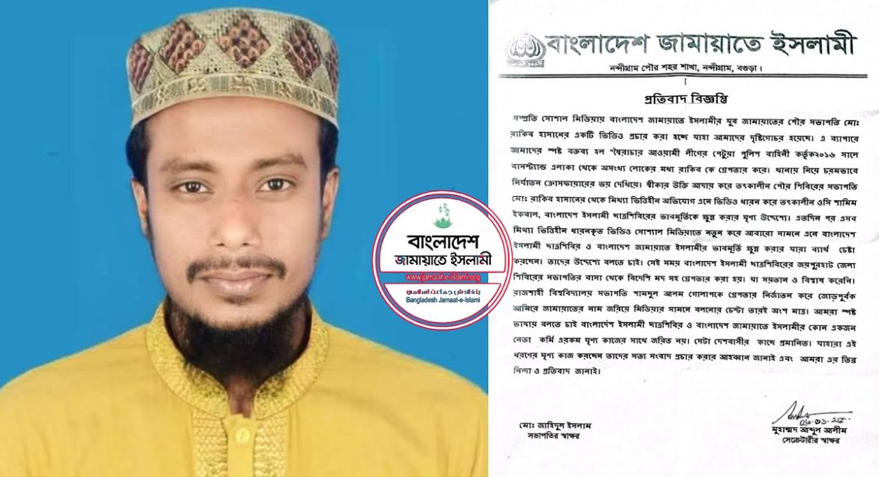বৃহস্পতিবার (২৩ জানুয়ারি) বাংলাদেশ জামায়াতে ইসলামী নন্দীগ্রাম পৌর শহর শাখার সভাপতি জাহিদুল ইসলাম ও সেক্রেটারি মুহাম্মদ আব্দুল আলীম এক যৌথ বিবৃতিতে এ নিন্দা ও প্রতিবাদ জানান। বিবৃতিতে বলা হয়, সম্প্রতি সোশাল মিডিয়ায় বাংলাদেশ জামায়াতে ইসলামীর যুব জামায়াতের পৌর সভাপতি মোঃ রাকিব হাসানের একটি ভিডিও প্রচার করা হচ্ছে যাহা আমাদের দৃষ্টিগোচর হয়েছে।এ ব্যাপারে আমাদের স্পষ্ট বক্তব্য হলো "স্বৈরাচার আওয়ামী লীগের পেটুয়া পুলিশ বাহিনী কর্তৃক ২০১৬ সালে বাসস্ট্যান্ড থেকে অসংখ্য লোকের মধ্য গ্রেফতার করে, চরমভাবে নির্যাতন ক্রোসফায়ারের ভয় দেখিয়ে স্বীকার উক্তি আদায় করে তৎকালীন পৌর শিবিরের সভাপতি মোঃ রাকিব হাসানের থেকে মিথ্যা ভিত্তিহীন অভিযোগ এনে ভিডিও ধারন করে তৎকালীন ওসি শামিম ইকবাল। বাংলাদেশ ইসলামী ছাত্রশিবিরের ভাবমূর্তিকে ক্ষুন্ন করার ঘৃণ্য উদ্দেশ্যে এতদিন পর এসব মিথ্যা ভিত্তিহীন ধারনকৃত ভিডিও সোশ্যাল মিডিয়াতে নতুন করে আবারো সামনে এনে বাংলাদেশ ইসলামী ছাত্রশিবির ও বাংলাদেশ জামায়াতে ইসলামীর ভাবমূর্তি ক্ষুন্ন করার যারা ব্যর্থ চেষ্টা করছেন। তাদের উদ্দেশ্যে বলতে চাই, সেই সময় বাংলাদেশ ইসলামী ছাত্রশিবিরের জয়পুরহাট জেলা শিবিরের সভাপতির বাসা থেকে বিদেশি মদ সহ গ্রেফতার করা হয়। যা সয়তান ও বিশ্বাস করেনি। রাজশাহী বিশ্ববিদ্যালয় সভাপতি শামছুল আলম গোলাপকে গ্রেফতার নির্যাতন করে জোরপূর্বক আমিরে জামায়াতের নাম জড়িয়ে মিডিয়ার সামনে বলানোর চেষ্টা তারই অংশ মাত্র। আমরা স্পষ্ট ভাষায় বলতে চাই বাংলাদেশ ইসলামী ছাত্রশিবির ও বাংলাদেশ জামায়াতে ইসলামীর কোন একজন কর্মী এরকম ঘৃণ্য কাজের সাথে জড়িত নয়। সেটা দেশবাসীর কাছে প্রমানিত। আমরা এর তীব্র নিন্দা ও প্রতিবাদ জানাই।