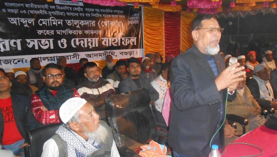বগুড়া-৩ (আদমদীঘি-দুপচাঁচিয়া) আসনের সাবেক এমপি মরহুম আব্দুল মোমিন তালুকদার খোকা’র রুহের মাগফিরাত কামনায় আদমদীঘির শালগ্রামে স্মরণ সভা ও দোয়া মাহফিল অনুষ্ঠিত হয়েছে। শনিবার সন্ধ্যায় উপজেলার শালগ্রাম প্রাথমিক বিদ্যালয় মাঠে এই দোয়া মাহফিল অনুষ্ঠিত হয়।