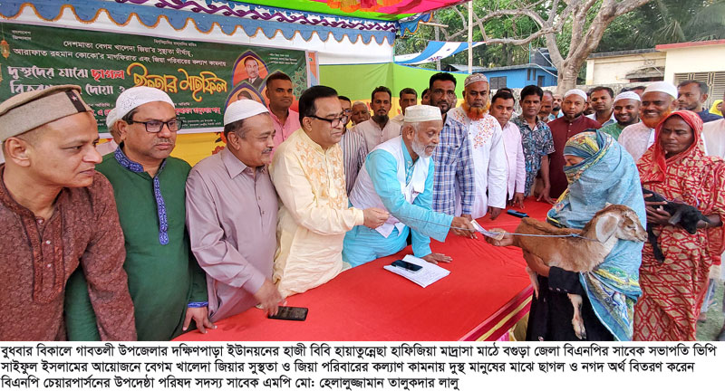 তিনি বুধবার বিকালে গাবতলী উপজেলার দক্ষিণপাড়া ইউানয়নের হাজী বিবি হায়াতুন্নেছা হাফিজিয়া মাদ্রাসা মাঠে বগুড়া জেলা বিএনপির সাবেক সভাপতি ভিপি সাইফুল ইসলামের আয়োজনে সাবেক প্রধানমন্ত্রী বিএনপি চেয়ারপার্সন বেগম খালেদা জিয়ার সুস্থতা কামনা, মরহুম আরাফাত রহমান কোকো আত্মার মাগফেরাত এবং জিয়া পরিবারের কল্যাণ কামনায় দুস্থ মানুষের মাঝে ছাগল, নগদ অর্থ ও ইফতার বিতরণ করেন প্রধান অতিথির বক্তব্যে একথাগুলো বলেন। এতে উপস্থিত ছিলেন বগুড়া জেলা বিএনপির সাংস্কৃতিক সম্পাদক ওয়াহিদ মুরাদ, জেলা বিএনপি নেতা ফারুকুল ইসলাম ফারুক, সৈয়দ আব্দুল গফুর দারা, গাবতলী উপজেলা যুবদলের আহবায়ক আরিফুর রহমান মজনু, পৌর যুবদলের সিনিয়র যুগ্ম আহবায়ক আব্দুল লতিফ, হাসানুজ্জামান পলাশ, সোহেল রানা সুমন, রুহুল আমিন সুমন, আতিকুল হোসেন বিপুল, আল-আমিন কিসু প্রমুখ।