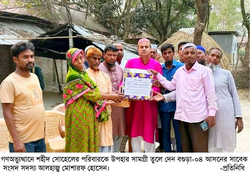 জুলাই-আগস্টে স্বৈরাচারবিরোধী গণঅভ্যুত্থানে পুলিশের গুলিতে নিহত বগুড়ার নন্দীগ্রাম উপজেলার শহীদ সোহেলের পরিবারের হাতে উপহার সামগ্রী তুলে দেওয়া হয়েছে। ২৬শে মার্চ বুধবার বিএনপির ভারপ্রাপ্ত চেয়ারম্যান তারেক রহমান কর্তৃক প্রদত্ত উপহার সামগ্রী তার পরিবারের হাতে তুলে দেন বগুড়া জেলা বিএনপির ভারপ্রাপ্ত সাধারণ সম্পাদক, বগুড়া-০৪ আসনের সাবেক সংসদ সদস্য আলহাজ্ব মোশারফ হোসেন। এ সময় সাবেক এমপি আলহাজ্ব মোশারফ হোসেন বলেন, স্বৈরাচারবিরোধী গণঅভ্যুত্থানে গত ৫ আগস্ট ঢাকার যাত্রাবাড়ীতে বিজয় মিছিল নিয়ে গণভবনে যাওয়ার পথে পুলিশের গুলিতে ক্ষতবিক্ষত হয়ে নিহত হন বগুড়ার নন্দীগ্রামের ৫নং ভাটগ্রাম ইউনিয়নের ভুস্কুর গ্রামের বীরশ্রেষ্ঠ শহীদ সোহেল রানা। আমরা শহীদ সোহেল রানার আত্মার মাগফেরাত কামনা করি। এবং বিএনপির ভারপ্রাপ্ত চেয়ারম্যান তারেক রহমান কর্তৃক প্রদত্ত উপহার সামগ্রী তার বাবা মায়ের হাতে তুলে দিয়েছি। এ সময় উপজেলা বিএনপির সাংগঠনিক সম্পাদক আব্দুল হাকিম সহ আরো অনেকেই উপস্থিত ছিলেন।