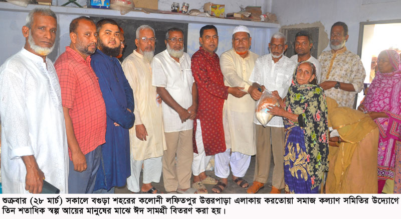 ঈদের সম আনন্দ ভাগাভাগি করতে বগুড়ায় তিন শতাধিক স্বল্প আয়ের মানুষের মাঝে ঈদ সামগ্রী বিতরণ করা হয়েছে। শুক্রবার বেলা ১০টায় শহরের কলোনী লফিতপুর উত্তরপাড়া এলাকায় করতোয়া সমাজ কল্যাণ সমিতি এসব সামগ্রী বিতরণ করে। এসময় উপস্থিত ছিলেন সমিতির সভাপতি আবু মুসা সরকার, প্রধান উপদেষ্টা আব্দুল হাই কাল্টু, সহ-সভাপতি নাহিদুল ইসলাম, সাধারণ সম্পাদক আনোয়ার হোসেন পলাশ, যুগ্ম সাধারণ সম্পাদক জাহেদুর রহমান পিন্টু, সাংগঠনিক সম্পাদক আব্দুল ওয়াদুদ মুকুল, দপ্তর সম্পাদক তরিকুল ইসলাম জকি, সদস্য আব্দুল মোমিন, মোখলেছার রহমান, আব্দুল মতিন, আলতাফ, নাজির হোসেন প্রমুখ। ঈদ উপহারের মধ্যে ছিল লাচ্ছা সেমাই, চিকন সেমাই, চিনি, দুধ, মসলাসহ বিভিন্ন নিত্যপ্রয়োজনীয় সামগ্রী যা একটি পরিবারকে ঈদ উদযাপনে সহায়তা করবে।
