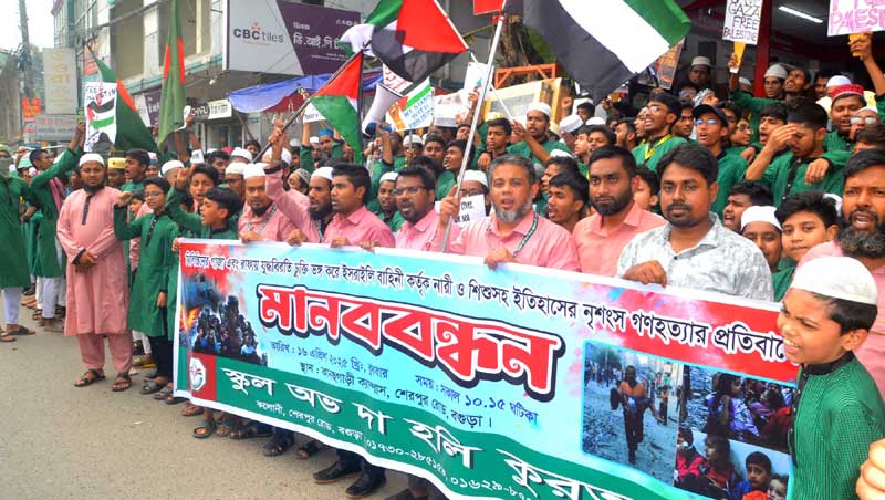 গাজায় গণহত্যার প্রতিবাদে বগুড়ায় স্কুল অভ দা হলি কুরআন এর মানববন্ধন