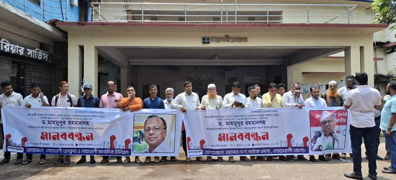 একুশে পদকপ্রাপ্ত দৈনিক আমার দেশের সম্পাদক ডঃ মাহমুদুর রহমানসহ সাংবাদিকদের বিরুদ্ধে ফ্যাসিবাদের দোসর মেঘনা গ্রুপের চেয়ারম্যান মোস্তফা কামাল কর্তৃক মিথ্যা ও হয়রানি মূলক মামলা করার প্রতিবাদে ও তার বিরুদ্ধে দ্রুত আইনানুগ ব্যবস্থা গ্রহণের দাবিতে নোয়াখালী প্রেসক্লাবের সামনে ঘন্টা ব্যাপী মানববন্ধন কর্মসূচি পালিত হয়েছে।