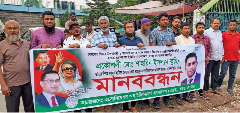 নীলফামারী ১-আসনের সাবেক সংসদ সদস্য বিএনপির জাতীয় নির্বাহী কমিটির সদস্য এবং এ্যাব’র সাবেক মহাসচিব প্রকৌশলী শাহরিন ইসলাম তুহিনের বিরুদ্ধে দায়ের করা মামলা প্রত্যাহার ও নি:শর্ত মুক্তির দাবিতে বগুড়ায় এ্যাব’র মানববন্ধন কর্মসূচী অনুষ্ঠিত হয়েছে। শাহরিন ইসলাম চৌধুরী তুহিন বিএনপির চেয়ারপার্সন বেগম খালেদা জিয়ার বোন সেলিমা ইসলামের ছেলে। ৩মে শনিবার বিকাল সাড়ে ৫টায় বগুড়া প্রেসক্লাবের সামনে এ্যাসোসিয়েশন অব ইঞ্জিনিয়ার্স বাংলাদেশ (এ্যাব) এর আয়োজনে এই মানববন্ধন হয়। মানববন্ধনে বক্তব্য রাখেন এ্যাসোসিয়েশন অব ইঞ্জিনিয়ার্স বাংলাদেশ বগুড়ার সভাপতি ইঞ্জিনিয়ার মো: রোকন তালুকদার, সংগঠনের সিনিয়র সহ-সভাপতি ইঞ্জিনিয়ার সৈয়দ গোলাম কাদের, সহ-সভাপতি ইঞ্জিনিয়ার ইকবাল হোসেন বাবু, সাধারণ সম্পাদক ইঞ্জিনিয়ার মো: মনির হোসেন, সাংগঠনিক সম্পাদক ইঞ্জিনিয়ার মো: মঈনুর হাসান রনি, সেন্টাল কাউন্সিল মেম্বার ইঞ্জিনিয়ার জাহাঙ্গীল আলম, ইঞ্জিনিয়ার মোবারক হোসেন, ইঞ্জিনিয়ার জাকির হোসেন, ইঞ্জিনিয়ার আব্দুল মালেক, ইঞ্জিনিয়ার আল মামুনুল রশিদ লিমন, ইঞ্জিনিয়া মো: রিপন, ইঞ্জিনিয়ার বাবু মিয়া, ইঞ্জিনিয়ার শিপন, ইঞ্জিনিয়ার শফিউল আল আজিজ, ইঞ্জিনিয়ার তাজনুর রহমান প্রমুখ।